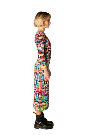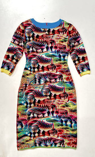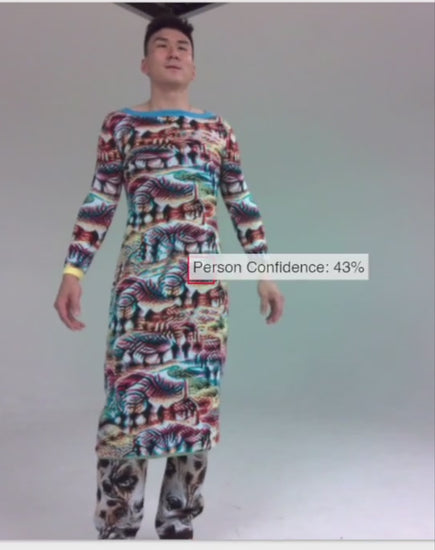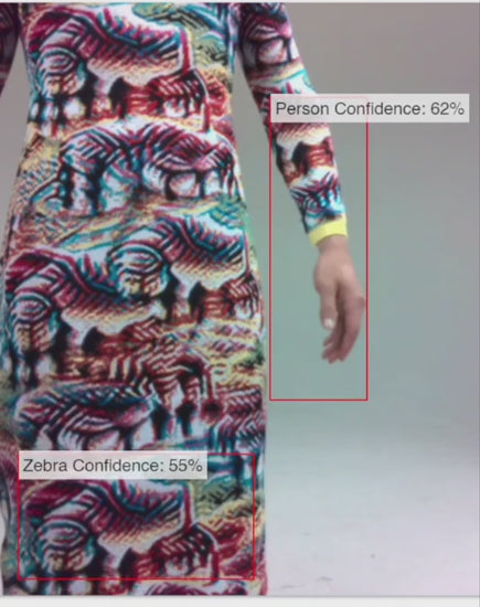 The Dress is part of the MANIFESTO COLLECTION about knitted garments that shield facial recognition.The algorithm on the textile hinders the object recognition software’s capabilities, causing it to not recognize the person wearing this garment. Instead, it recognizes the textile as nothing, a “zebra”, or a “giraffe”.